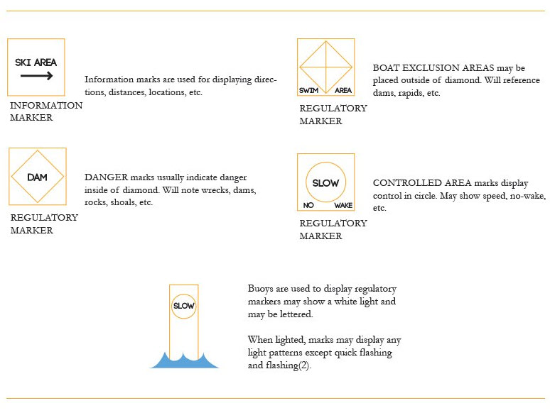 Additionally, regulatory markers are directional or warning signs, similar to those you may see when driving on the roads. Some signs warn you about decreasing your wake, while others may mark some hidden, underwater danger.