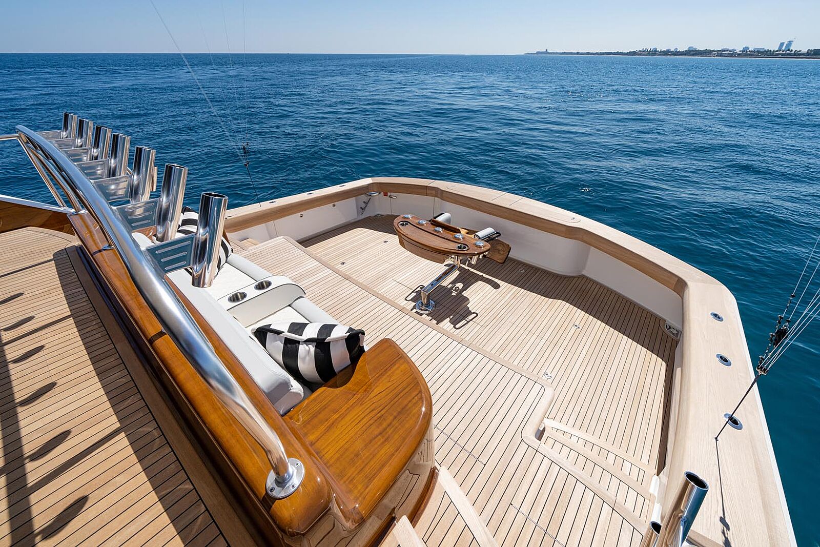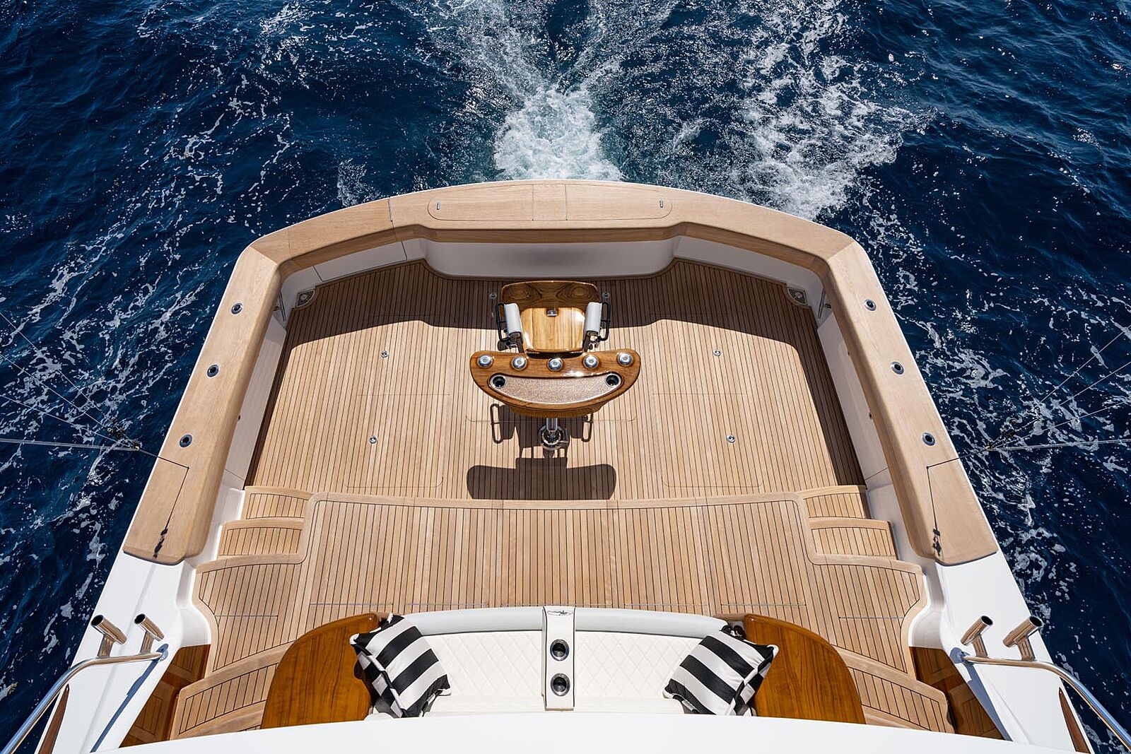 Forward of the helm console in the flybridge are additional seating areas for guests to enjoy the ride. Bench seating is found port and starboard with more drinkholders. Additional storage spaces are found under the seats. A u-shaped couch with teak pedestal table provides a great space to dine al fresco with a view!
