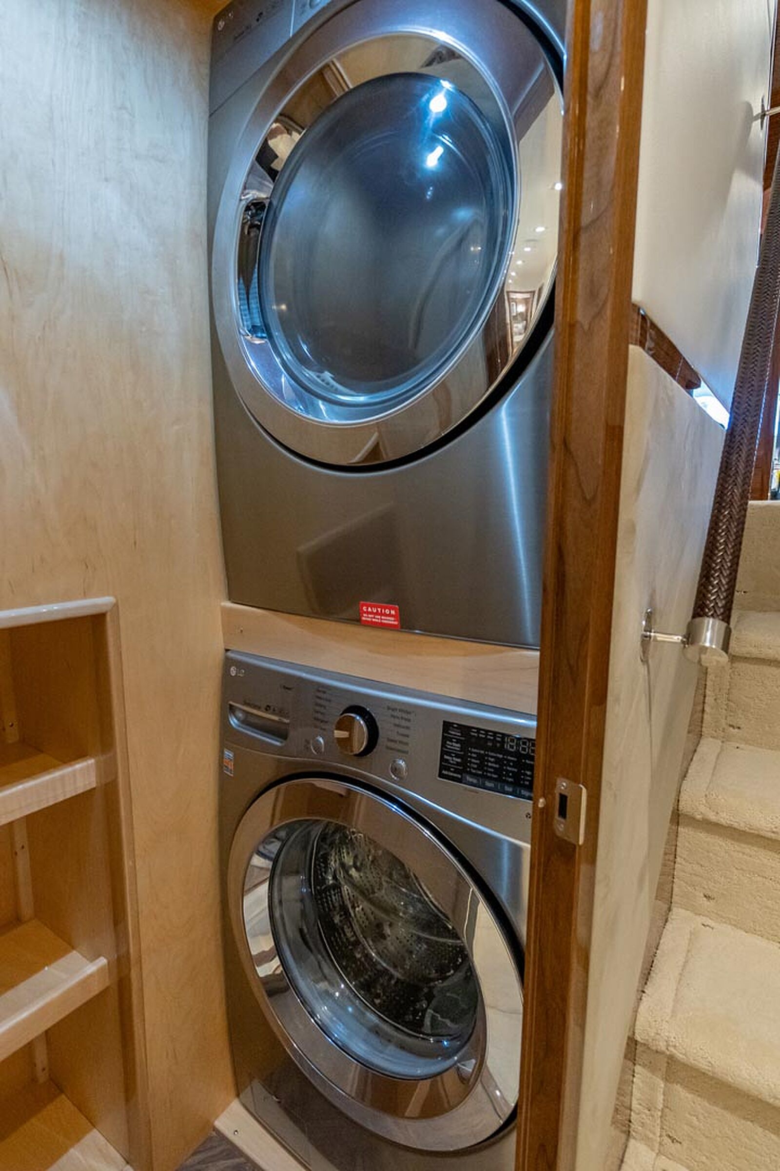 A large, well-equipped galley with an abundance of storage and counter space is found starboard. Viking equips every model with only the highest quality refrigeration, freezers, and cooking appliances. Corian countertops come in multiple colors to match your décor and there are 5 barstools seated around it. Across from the galley portside is the formal dining area. This area consists of a beautiful teak dining table and chairs for 6 guests.