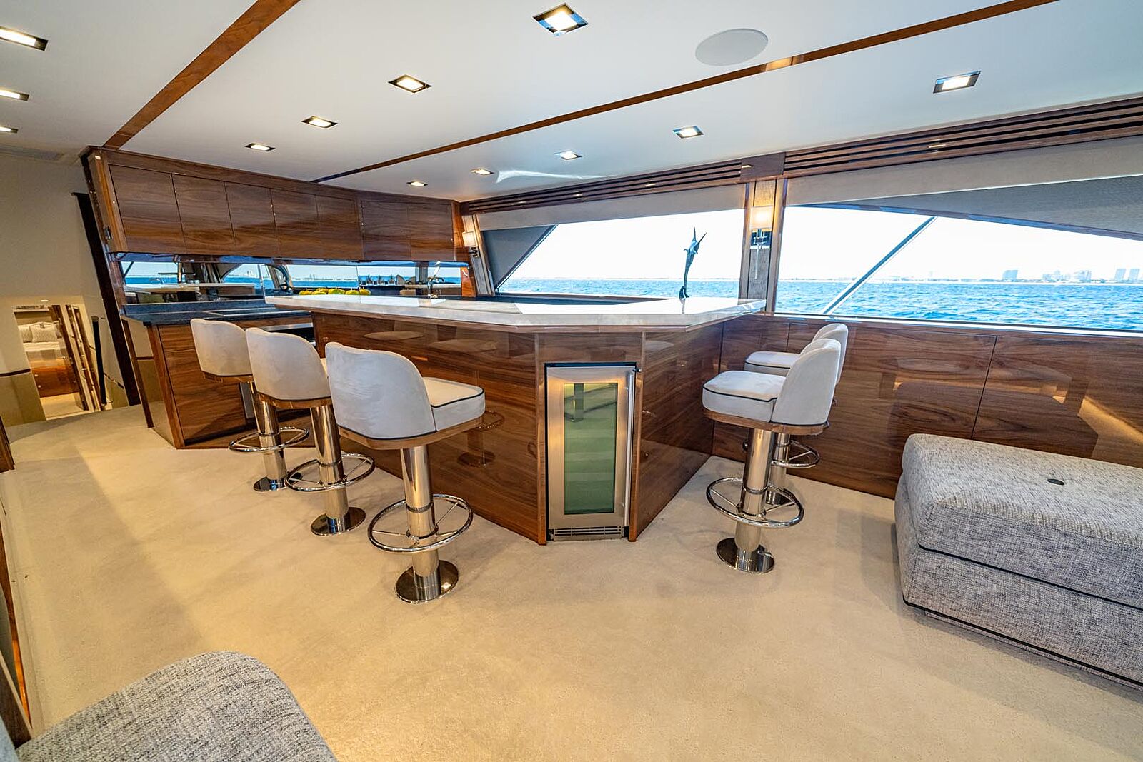 Tournament boats are judged at the transom, and the 90’s “business end” reads like a working blueprint for marlin crews. You get a 224-square-foot teak cockpit—huge by any measure—built with a reinforced sole for a Release chair, rocket launcher or table. The transom carries a 203-gallon livewell/fishbox, flanked by a pair of full-length, 103-gallon insulated in-deck boxes that can be refrigerated. A single, centerline, watertight hatch gives direct access to the Seakeeper 35 for maintenance—a thoughtful touch when you’re doing turnarounds mid-series. Three aft-facing mezzanine seating areas keep eyes on the spread while cooling the crew (the seatbacks can be air-conditioned), and there’s abundant freezer/refrigeration stowage so you can carry serious bait and food without clutter. It’s a cockpit you can work with six anglers, two mates and a camera boat hovering, yet it never feels congested.
