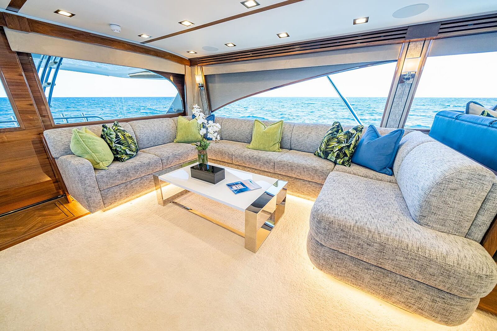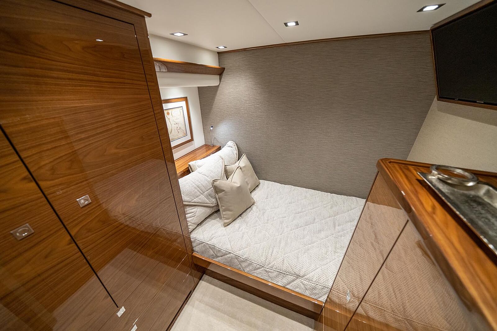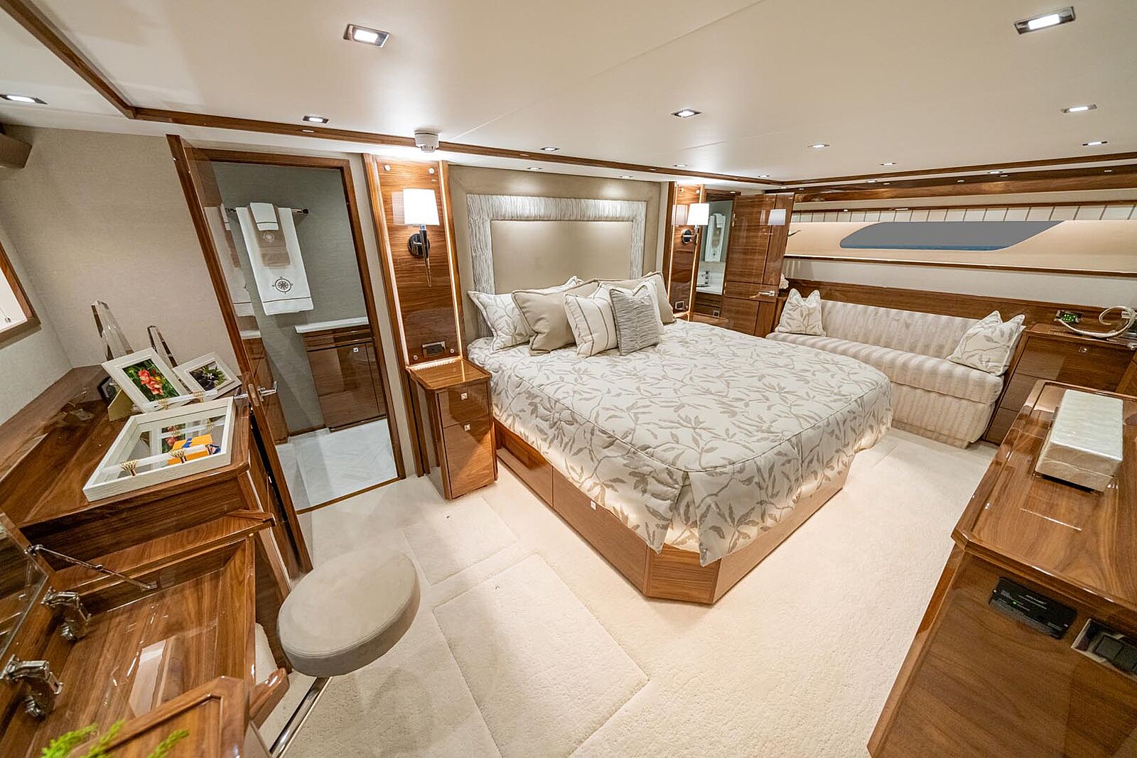 As you enter the salon, portside is a large couch that wraps around with two cocktail tables and additional chairs that creates a wonderful space to enjoy conversation with friends. A 65-inch flatscreen television sits across from the couch, perfect for watching the big game while catching big game! Owners will appreciate the stunning horizontal grain natural walnut wood that provides warmth and style to the interior. Viking does offer customization opportunities equivalent to many custom boat builders.