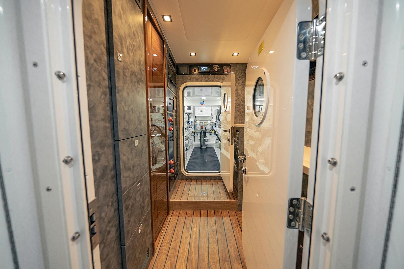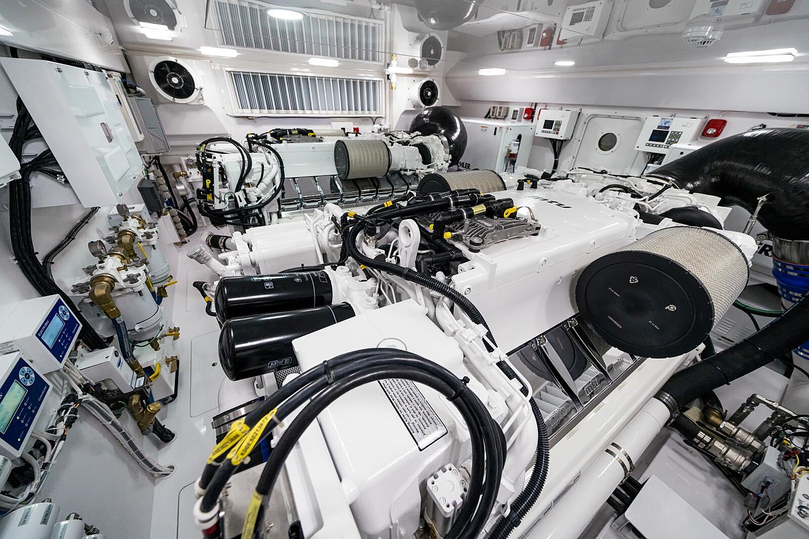 Crew operations got equal attention. There’s a proper two-berth crew cabin with galley, a separate shower and washer/dryer combo, and, critically, direct access to the cockpit and the engineroom so mates can move between systems and the deck without tracking through the salon. Down below, the engineroom itself is a study in serviceability, with over seven feet of headroom and more than 40 inches between those optional 16V2000s. Everything is finished in high-visibility Snow White and arranged for 360-degree access, which means routine checks happen faster and fault-finding isn’t a time-sink. That’s what you want when a stray gob of weed eats a raw-water pump at 0300.