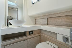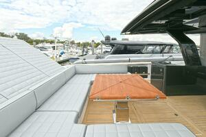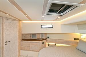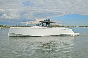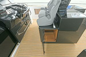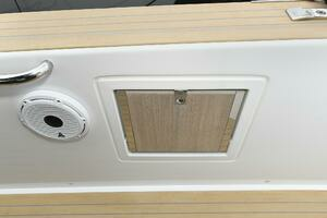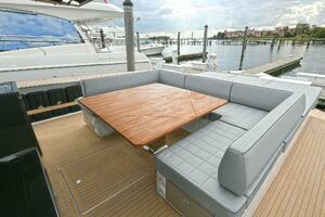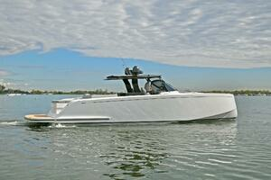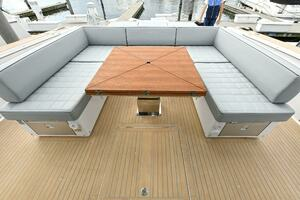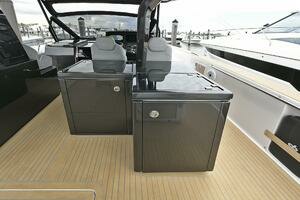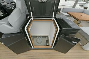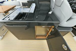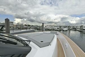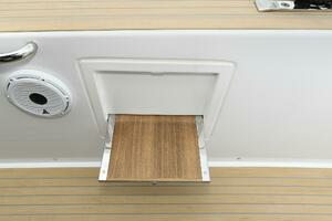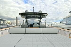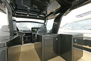 The deck is walkaround, developed on a unique surface, from bow to stern. The high freeboards provide great safety when having children or guests on board. The 172-square foot fixed T-top is made of rigid and light carbon fiber spreading from the cockpit to the dining area.