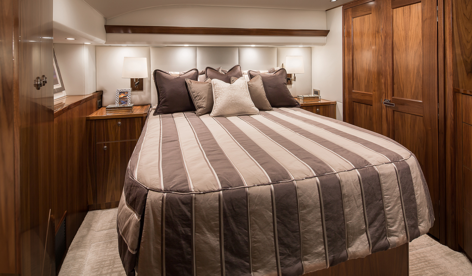 The master stateroom (pictured below) on the 68C is placed midships, is full-sized, and has an en suite head. Because it stretches almost the full beam of the boat, there is plenty of space not only to move around but for storage. The master cabin comes with his-and-hers maple-lined hanging lockers and credenzas. The forward VIP stateroom features a walk-around queen-sized bed and an en-suite bathroom.