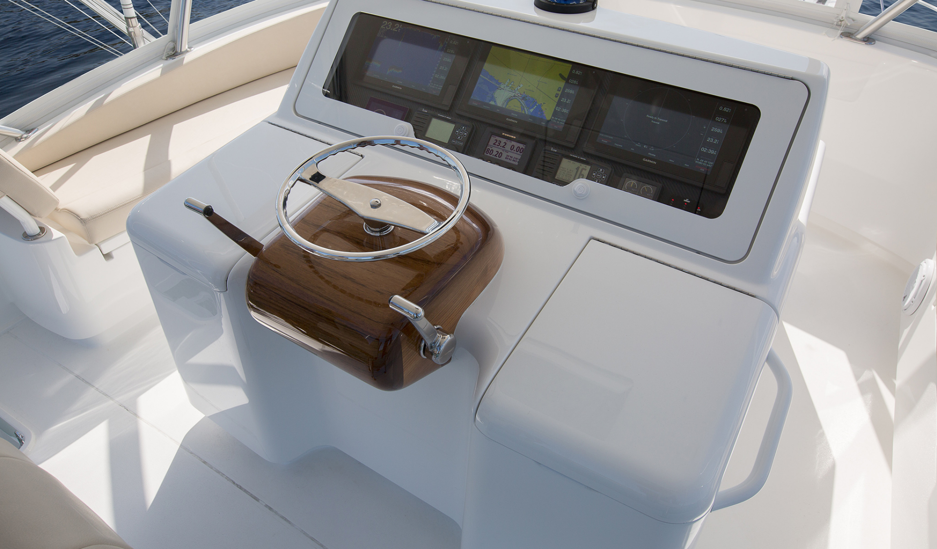 Commanding that much power on a 44-boat from the flybridge helm is an experience that owners will love. The center-console walk-around helm (pictured below) has a clear view of the cockpit along with amazing 360-degree visibility. An available fiberglass hardtop can be ordered that has overhead instrumentation and teaser reel compartments, as well as a Costa Clear enclosure.